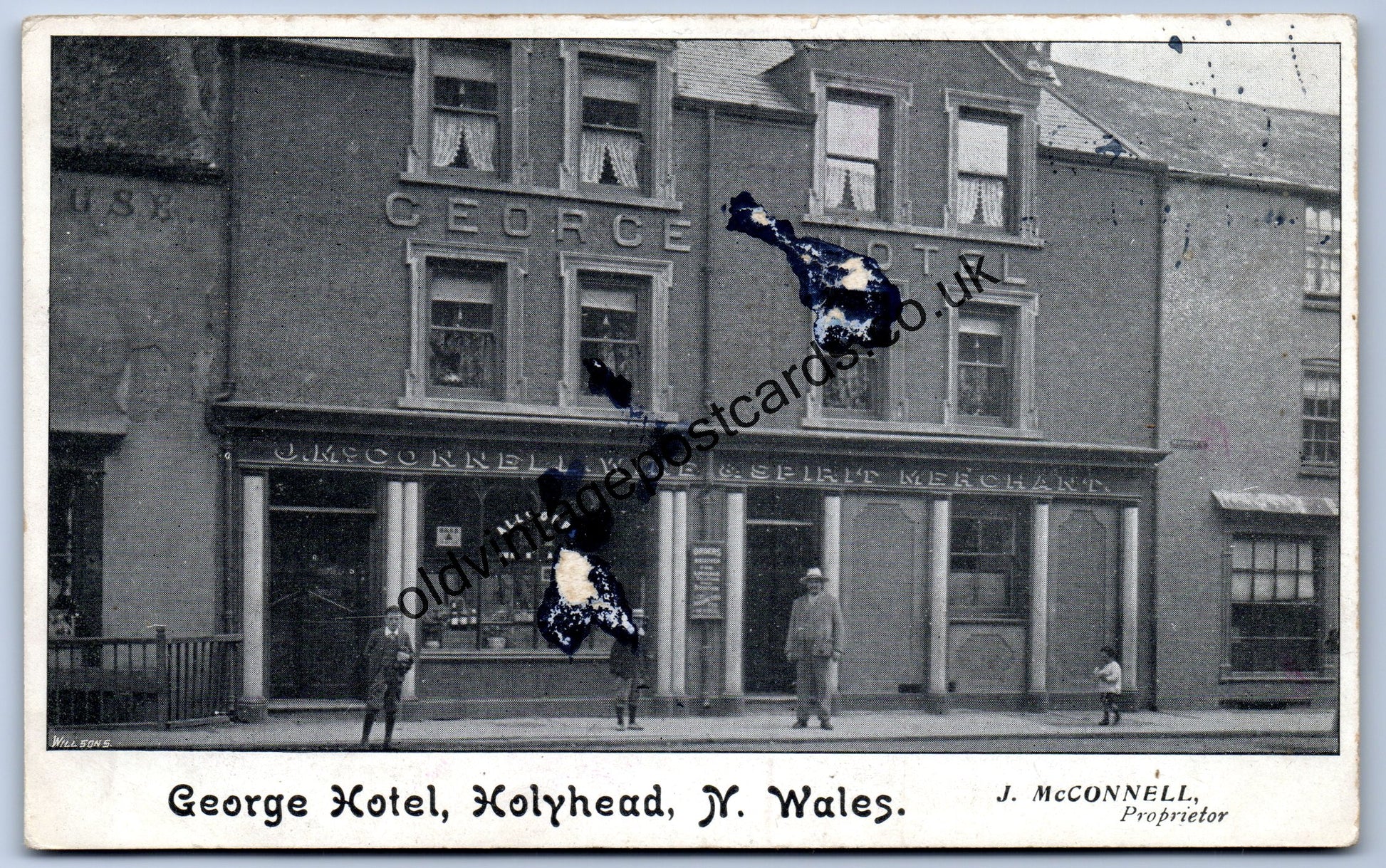A lovely old postcard of the George Hotel in Holyhead, North Wales, and the wine and spirit merchant shop J. McConnell.